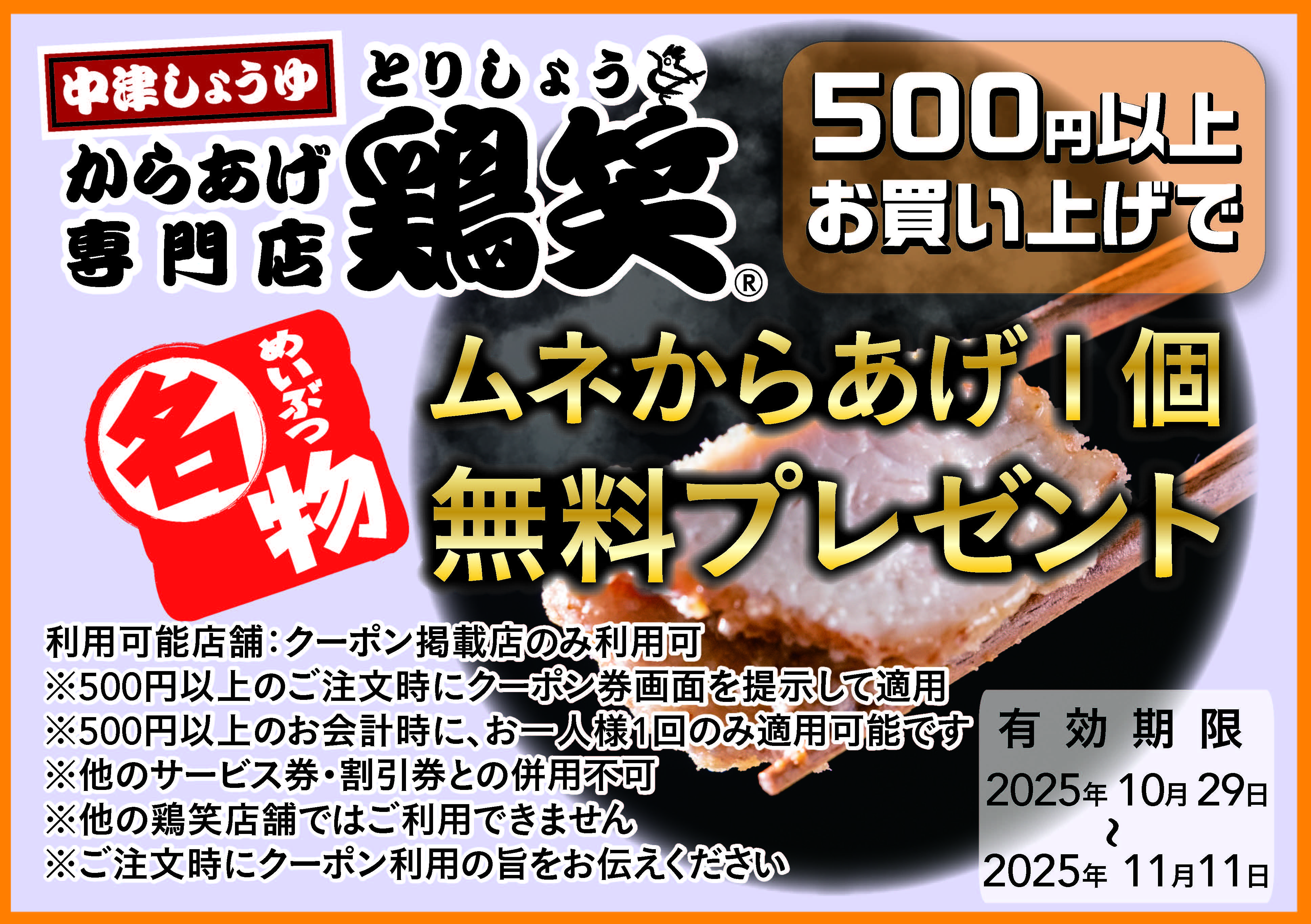 からあげ専門店 鶏笑 御殿場店のクーポン一覧