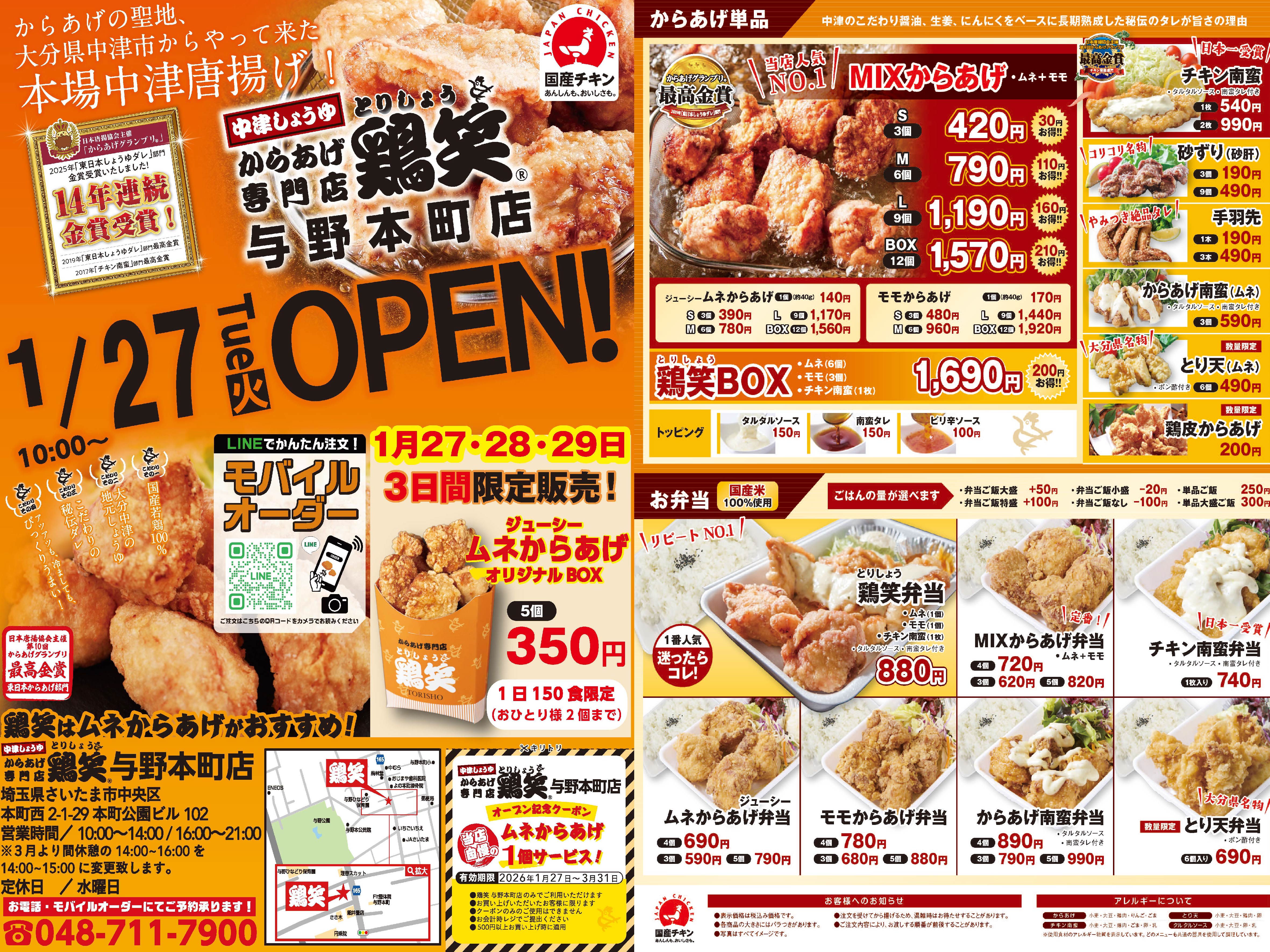 からあげ専門店 鶏笑 与野本町店【2026年1月27日オープン】